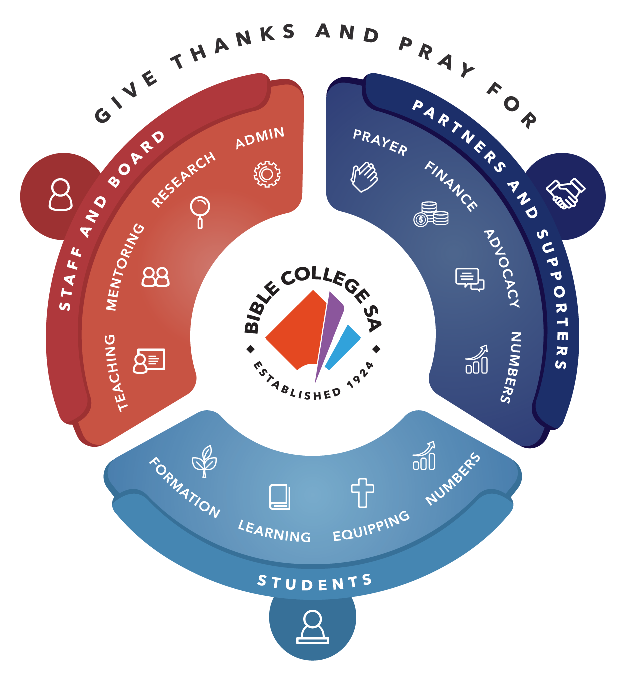 For our students, we give thanks to God for the number we already have, and pray for more, and we also ask for their academic work and overall ministry formation. For our staff, we remember their teaching, research, and administrative duties before God. And for our supporters, we ask God to keep growing their numbers, and pray that they would continue to be with us in financial support, prayer support, and advocacy. If you would like to print out a larger copy of the prayer wheel so you can stick it on your fridge or in with your Bible notes, you can download it by clicking on the link below. Please join us in praying around the wheel, and adding in more specific needs as you know of them too.